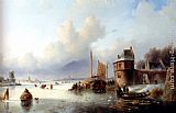 A Winter Landscape With Numerous Skaters On A Frozen Waterway, Dordrecht In The Distance by Jan Jacob Coenraad Spohler