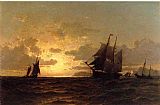 Fishermen unloading the catch with a merchant ship in calm water off Brymer Bay, Devon by Thomas Luny