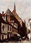 A Busy Street In Bremen With The Saint Johann Church In The Background by Cornelis Springer