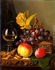 A Still Life of Black Grapes, a Peach, a Plum, Hazelnuts, a Metal Casket and a Wine Glass on a Carved Wooden Ledge by Edward Ladell