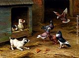 Puppies and Pigeons playing by a Kennel by Edgar Hunt