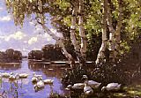 Elf Enten Unter Birken Und Im Wasser by Alexander Koester