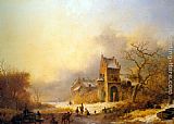 Figures on a frozen river in a winter landscape by Frederik Marianus Kruseman