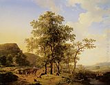 A Treelined River Landscape with Figures and Cattle an a Path by Hendrikus van den Sande Bakhuyzen