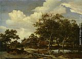 A wooded landscape with a figure crossing a bridge over a stream by Meindert Hobbema