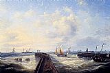 Fishing Boats Off A Jetty At Ostend by Louis Verboeckhoven