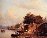 Numerous Townsfolk On A Quay Of A Town Along The Rhine by Everhardus Koster