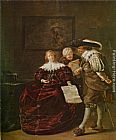 The contract - A lady presenting a letter to a gentleman and an old lady studying another in an interior by Jacob Duck