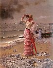 Jeune femme a l'ombrelle rouge au bord de la mer by Alfred Stevens
