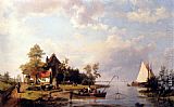 A River Landscape With A Ferry And Figures Mending A Boat by Hermanus Koekkoek Snr