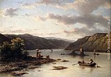 A Rhenish River Landscape With Fishermen In A Boat And Washerwomen On A Bank by Johannes Hilverdink