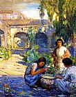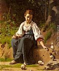 A Young Girl feeding Baby Chicks by Francois Alfred Delobbe