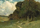 landscape, boat moored near stream, man walking in foreground by Edward Mitchell Bannister