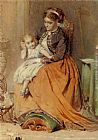 A girl listening to the ticking of a pocket watch while sitting on her mothers lap by George Elgar Hicks