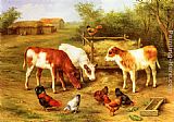 Calves and Chickens feeding in a Farmyard by Edgar Hunt