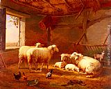 Sheep With Chickens And A Goat In A Barn by Eugene Verboeckhoven