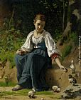 Young Girl Feeding the Baby Chicks by Francois Alfred Delobbe