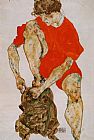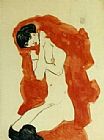 Female Model in Bright Red Jacket and Pants by Egon Schiele