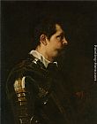 Portrait of a Military Commander bust length in Profile in Damascened armour with white collar and red sash by Sir Antony van Dyck