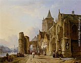 Figures In The Streets Of A Dutch Town, A Church In The Background by Johannes Bosboom