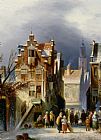 Figures in a Wintry Dutch town by Johannes Franciscus Spohler