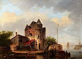 A River Landscape In Summer With A Moored Haybarge By A Fortified Farmhouse by Jan Jacob Coenraad Spohler