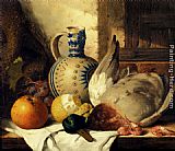 Prawns, A Mallard, A Lemon, An Apple, Grapes And A Stoneware Jug On A Draped Wooden Ledge by Edward Ladell
