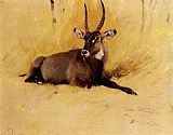 Goats grazing beside a lake at sunset by Henri-Joseph Harpignies