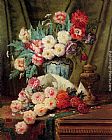 Still Life Of Roses And Other Flowers On A Draped Table by Modeste Carlier