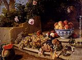 Still Life Of Grapes, Peaches In A Blue And White Porcelain Bowl And A Melon, Resting On A Stone Stairway by Alexandre-Francois Desportes