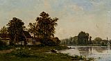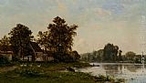 A Sunlit River Landscape With Cows Watering by Willem Roelofs