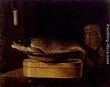 Still Life Of A Carp In A Bowl Placed On A Wooden Box, All Resting On A Table by Sebastien Stoskopff