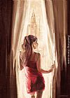 Standing Girl in a Blue Dress and Green Stockings Back View by Egon Schiele