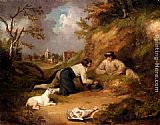 Two Men Hunting Rabbits With Their Dog, A Village Beyond by George Morland