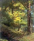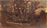 forest scene, fallen tree in foreground and house in background by Edward Mitchell Bannister
