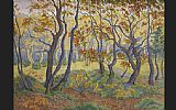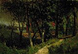 landscape, forest scene with red fence and building by Edward Mitchell Bannister