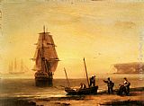 Fishermen unloading the catch with a merchant ship in calm water off Brymer Bay, Devon by Thomas Luny