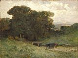 forest scene with bridge, cows in stream in foreground by Edward Mitchell Bannister
