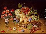 A Still Life Of A Vase Of Carnations To The Left Of A Basket Of Fruit by Gerrit van Honthorst