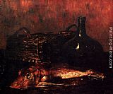 A Still Life With A Fish, A Bottle And A Wicker Basket by Antoine Vollon