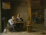A man and woman smoking a pipe seated in an interior with peasants playing cards on a table by David the Younger Teniers
